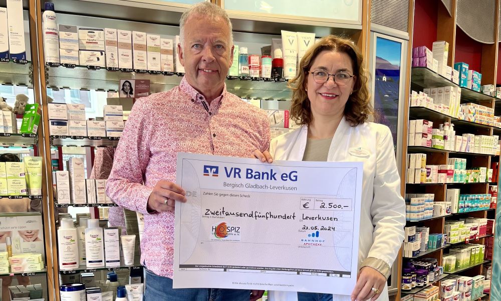 Der Hospizverein Leverkusen freut sich über eine großzügige Spende der Bahnhofapotheke in Küppersteg.